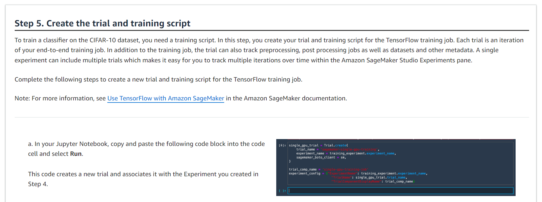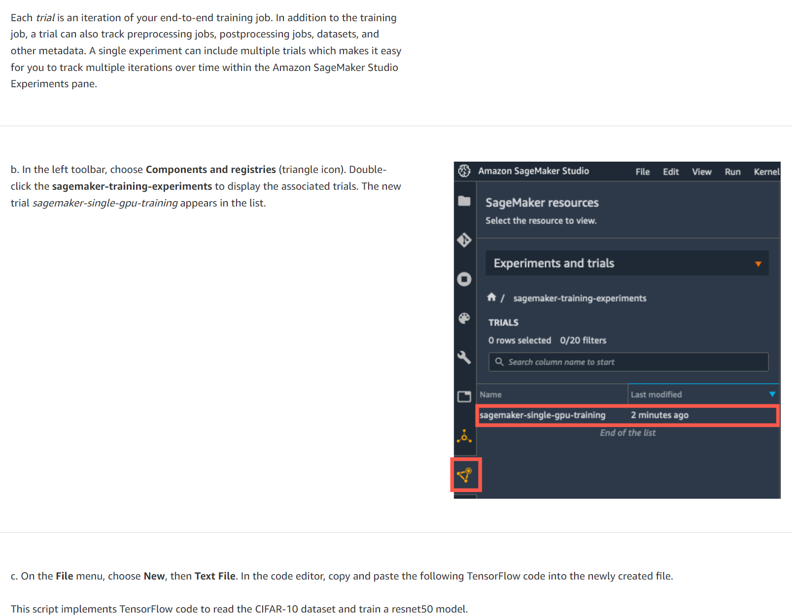 CIFAR-10 데이터 세트에서 분류기를 훈련하려면 훈련 스크립트가 필요합니다. 이 단계에서는 TensorFlow 학습 작업을 위한 평가판 및 학습 스크립트를 만듭니다. 각 시도는 엔드 투 엔드 훈련 작업의 반복입니다. 훈련 작업 외에도 평가판에서는 전처리, 후처리 작업은 물론 데이터 세트 및 기타 메타데이터도 추적할 수 있습니다. 단일 실험에는 여러 시도가 포함될 수 있으므로 Amazon SageMaker Studio 실험 창 내에서 시간 경과에 따른 여러 반복을 쉽게 추적할 수 있습니다.