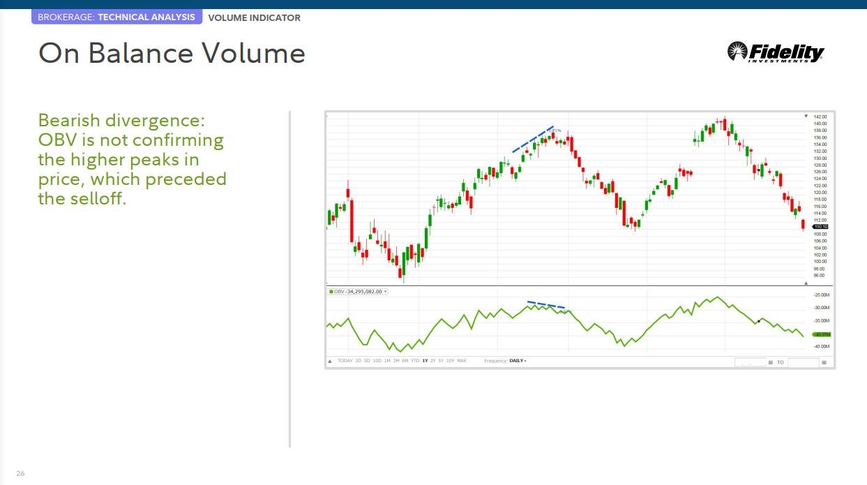 • 가격이 계속해서 더 높은 고점을 만들고 OBV가 더 높은 고점을 만들지 못하면 상승 추세가 멈추거나 실패할 가능성이 있습니다. 이를 네거티브 다이버전스라고 합니다.