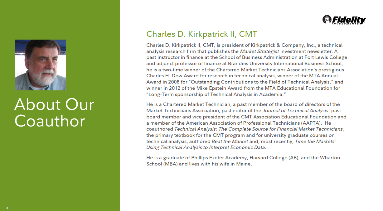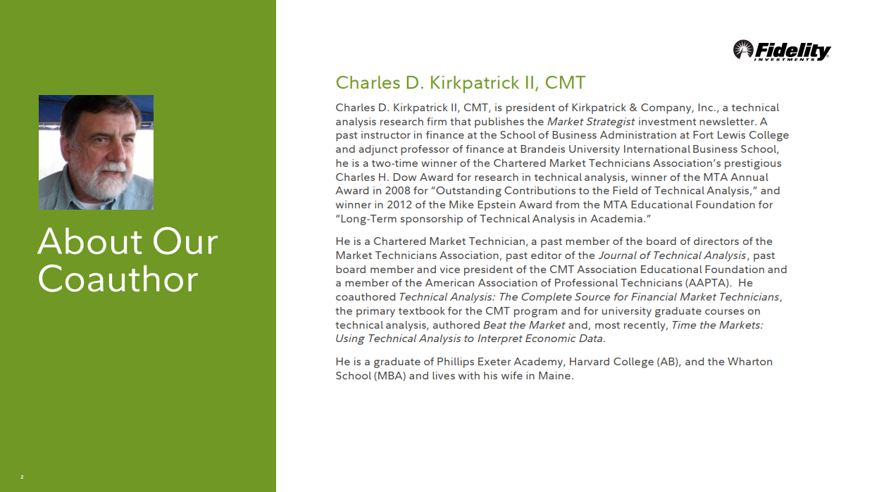 Charles D. Kirkpatrick II, CMT는 Market Strategist 투자 뉴스레터를 발행하는 기술 분석 연구 회사인 Kirkpatrick & Company, Inc.의 사장입니다. Fort Lewis College의 경영학부 교수이자 Brandeis University International Business School의 겸임 교수인 그는 기술 분석 연구로 Market Technicians Association의 권위 있는 Charles H. Dow Award를 두 번 수상했습니다. , "기술 분석 분야에 대한 뛰어난 공헌"으로 2008년 MTA 연례 상을 수상했으며, 2012년 "학계에서 기술 분석의 장기 후원"으로 MTA 교육 재단의 Mike Epstein Award를 수상했습니다.