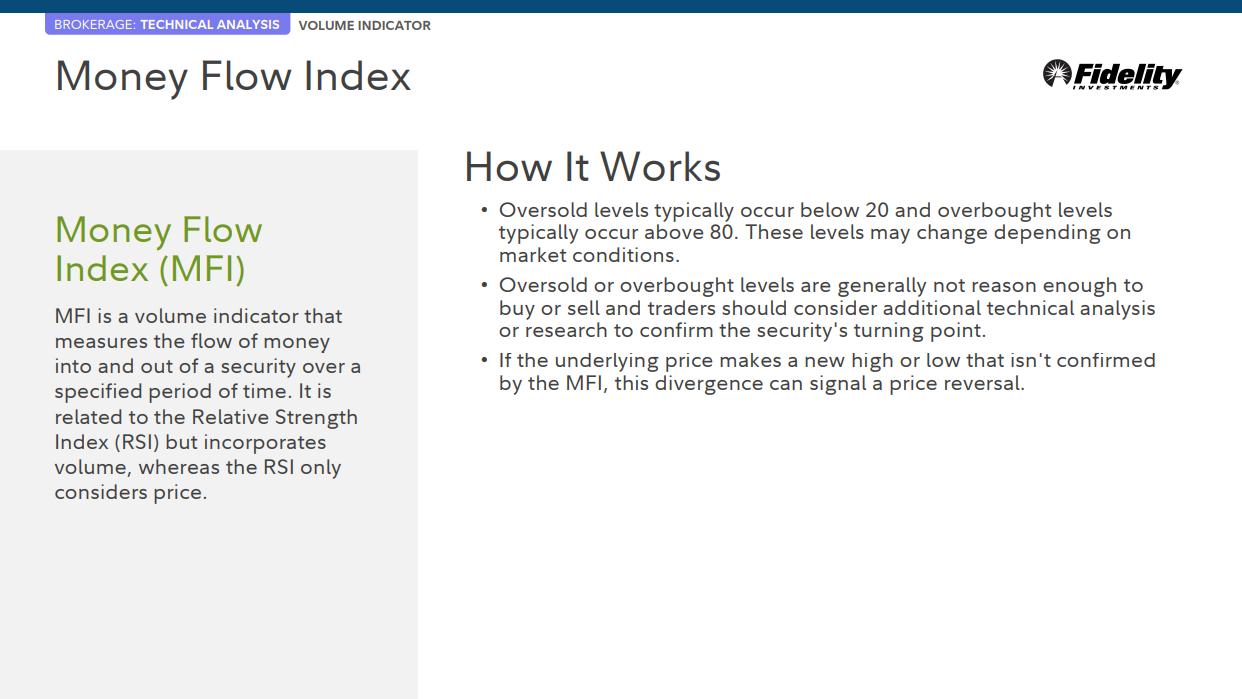 MFI는 특정 기간 동안 security 안팎으로 유입되는 자금의 흐름을 측정하는 거래량 지표입니다. RSI(Relative Strength Index)와 관련이 있지만 거래량을 포함하는 반면 RSI는 가격만 고려합니다.