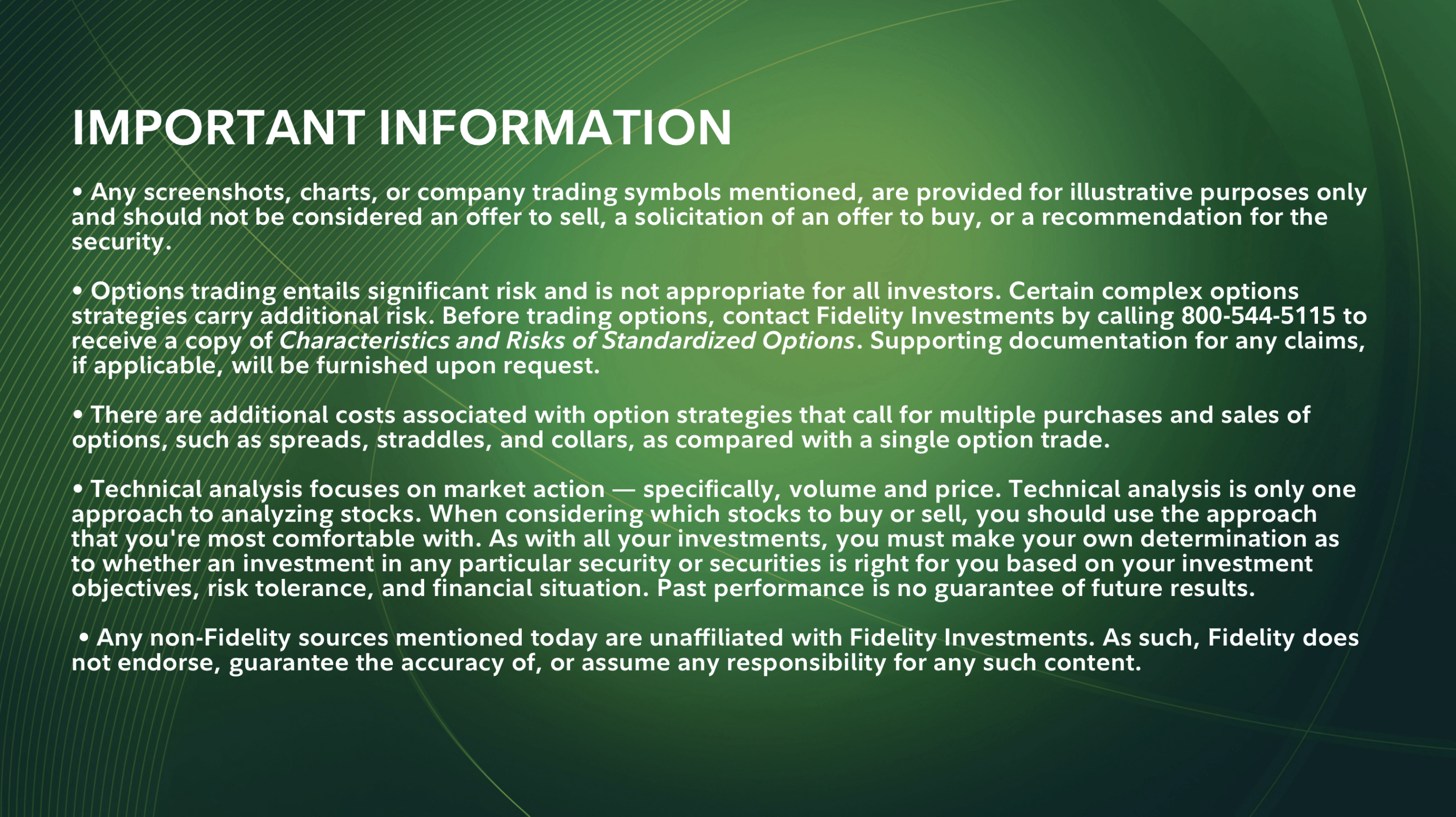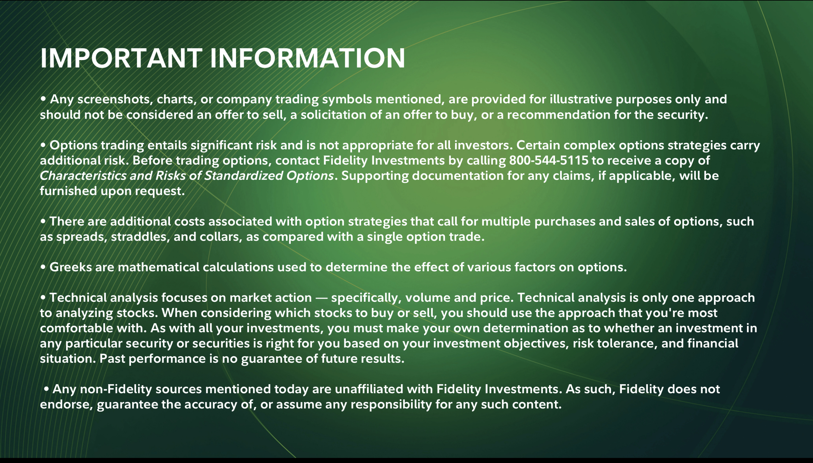 중요 정보 • 언급된 모든 스크린샷, 차트 또는 회사 거래 기호는 설명 목적으로만 제공되며 매도 제안, 매수 제안 권유 또는 증권에 대한 추천으로 간주되어서는 안 됩니다. • 옵션 거래는 상당한 위험을 수반하며 모든 투자자에게 적합하지 않습니다. 특정 복합 옵션 전략은 추가적인 위험을 수반합니다. 옵션을 거래하기 전에 800-544-5115로 전화하여 Fidelity Investments에 연락하여 표준화된 옵션의 특성 및 위험 사본을 받으십시오. 모든 청구에 대한 증빙 문서는 해당되는 경우 요청 시 제공됩니다.