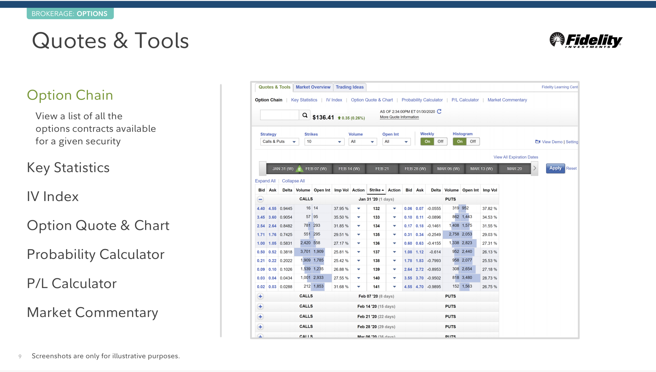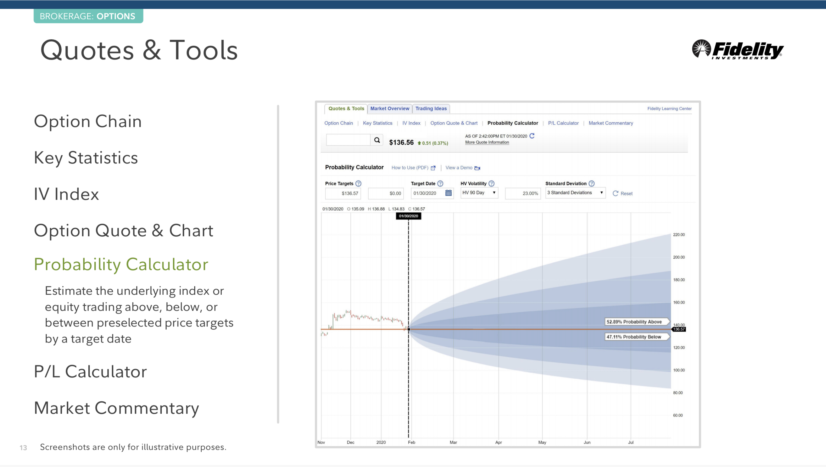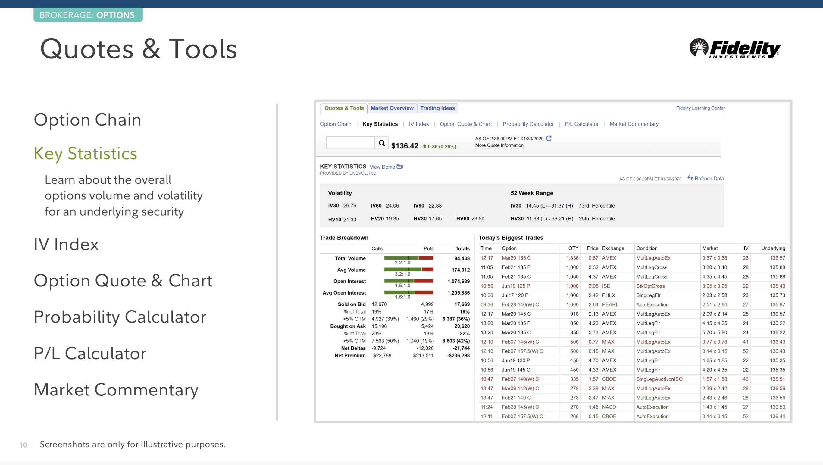 핵심 통계, 잠재 변동성 지표, 옵션 Quote 와 챠트, 개연성 계산기, P/L 계산기, 시장에 대한 논평