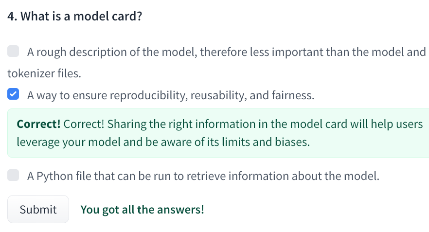 모델을 게시할 때 모델 카드는 필수 사항이 아니며, 모델을 만들 때 위에 설명된 모든 섹션을 포함할 필요는 없습니다. 그러나 모델에 대한 명시적인 문서화는 미래의 사용자에게만 도움이 될 수 있으므로 귀하의 지식과 능력을 최대한 활용하여 가능한 한 많은 섹션을 작성하는 것이 좋습니다.