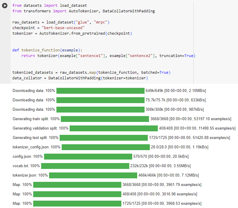 따라서 코드를 실행하면 tokenized_datasets 변수에는 토큰화된 MRPC 데이터셋이 저장되게 됩니다. 이제 이 토큰화된 데이터셋을 사용하여 모델 훈련이나 추론과 같은 NLP 작업을 수행할 수 있습니다.