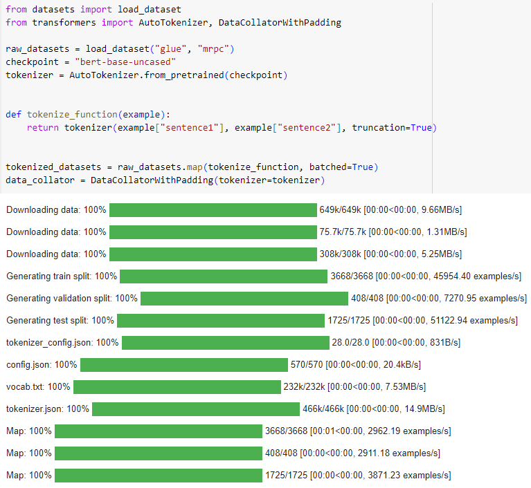 이 함수를 이용하면 MRPC 데이터셋의 각 예시에 대해 사용자가 원하는 방식으로 토큰화를 수행할 수 있습니다. 이러한 사용자 정의 토크나이즈 함수는 데이터셋을 처리하거나 모델에 입력을 제공하는 등의 작업에서 유용하게 사용될 수 있습니다.