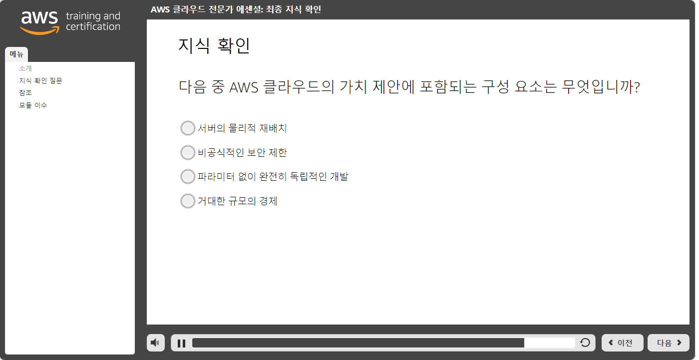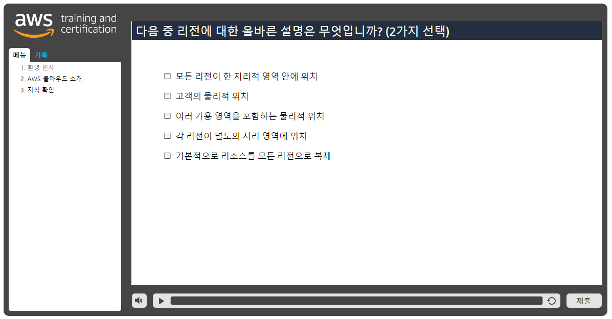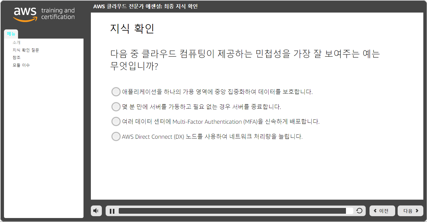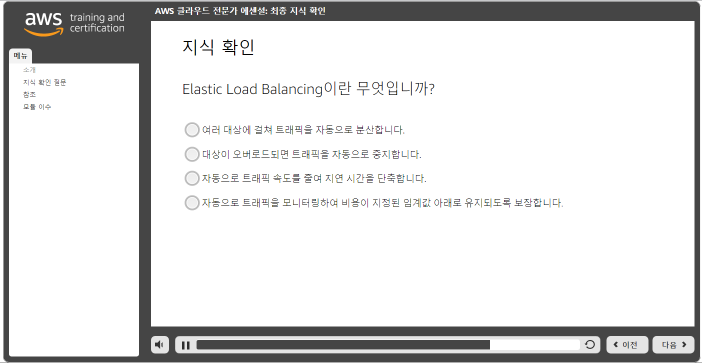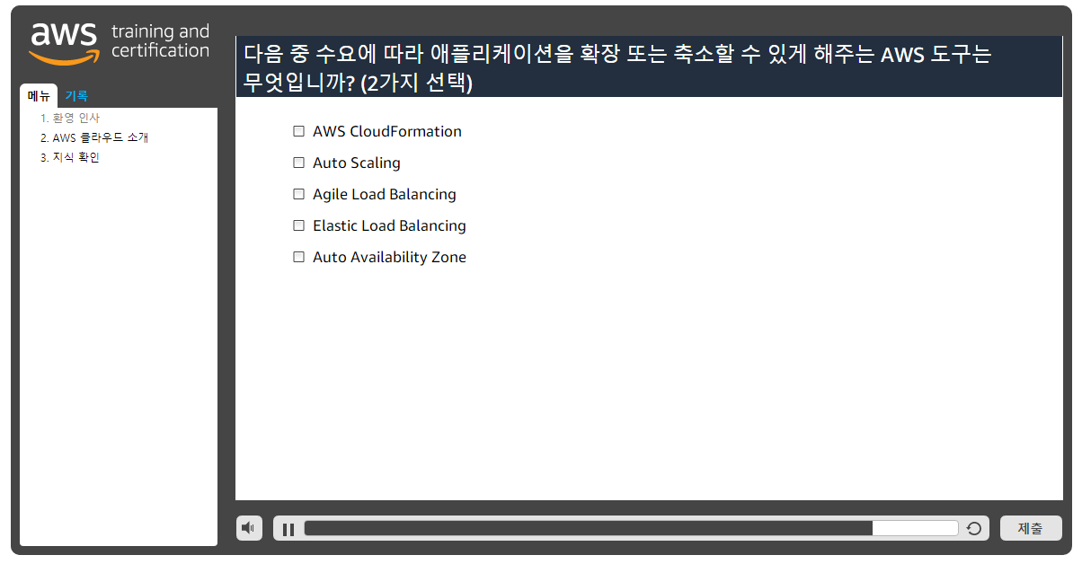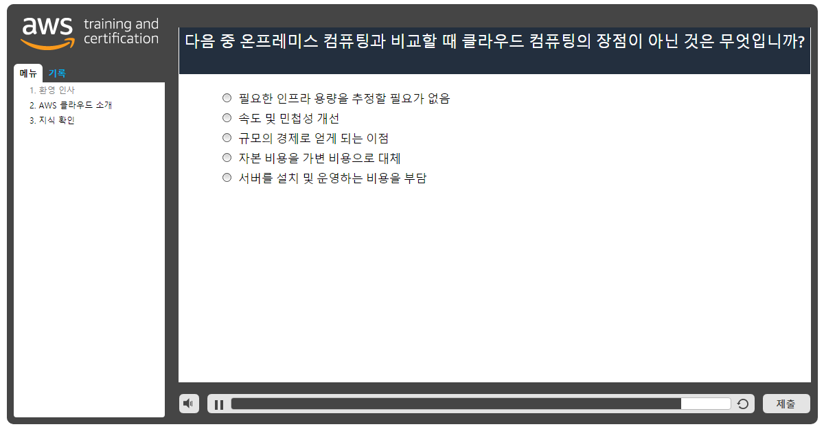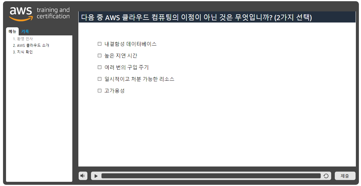| AWS Cloud Practitioner Essentials (Digital) (Korean) - 01 (0) | 2019.12.29 |