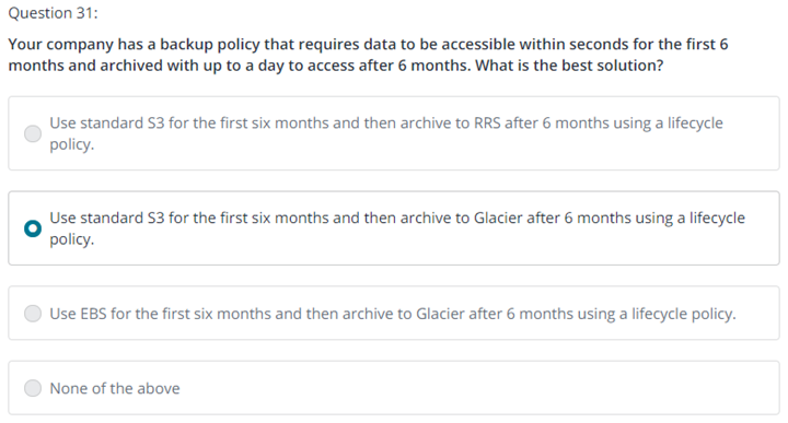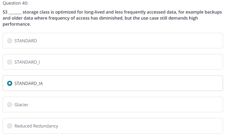 Correct. Using a lifecycle policy to move data to S3 Standard-IA satisfies all application requirements and provides the lowest-cost option. To learn more about S3 Standard-IA, see: Amazon S3 Storage Classes