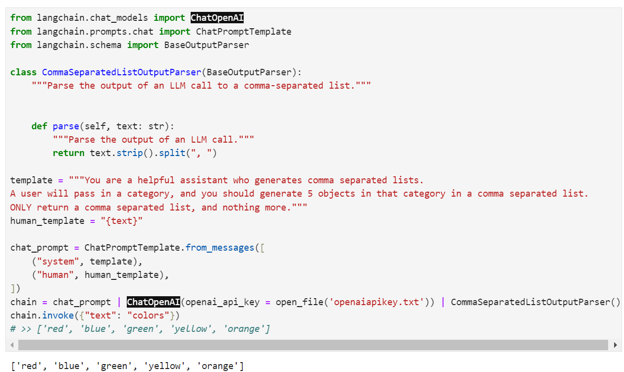 chain = chat_prompt | ChatOpenAI() | CommaSeparatedListOutputParser()