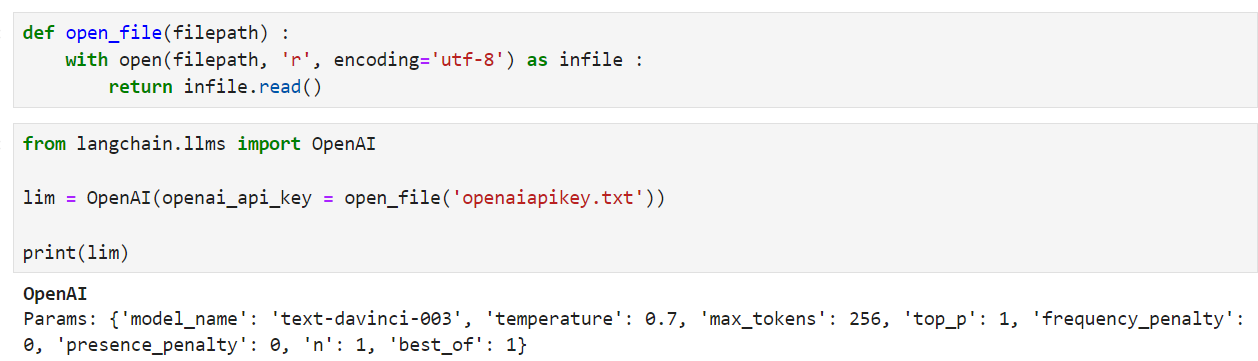 환경 변수를 설정하지 않으려는 경우 OpenAI LLM 클래스를 시작할 때 openai_api_key라는 매개변수를 통해 직접 키를 전달할 수 있습니다.