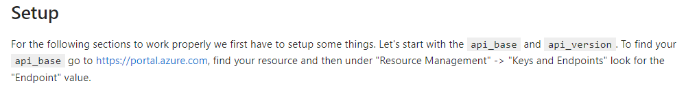 For the following sections to work properly we first have to setup some things. Let's start with theapi_baseandapi_version. To find yourapi_basego tohttps://portal.azure.com, find your resource and then under "Resource Management" -> "Keys and Endpoints" look for the "Endpoint" value.
