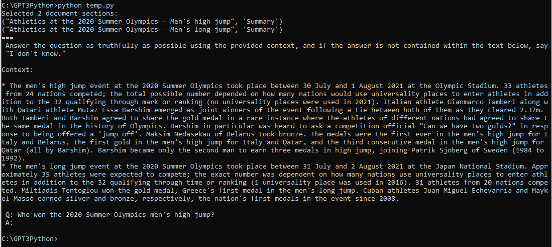 어쨌든 이 예제에서 배우고자 했던 소스를 제공하고 거기에 대해 embedding 을 이용해 유사값을 구한 다음 Completion을 통해 질문에 대한 답을 구하는 과정을 완료 했습니다.