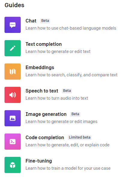 이번 업데이트는 Get Started, Guides 그리고 API Reference 에 많은 페이지들이 추가 됐구요 그 중 Guides 에 추가 된 Chat completion, Speech to text, Rate limit 그리고 Error codes 페이지는 다 살펴 보았습니다.