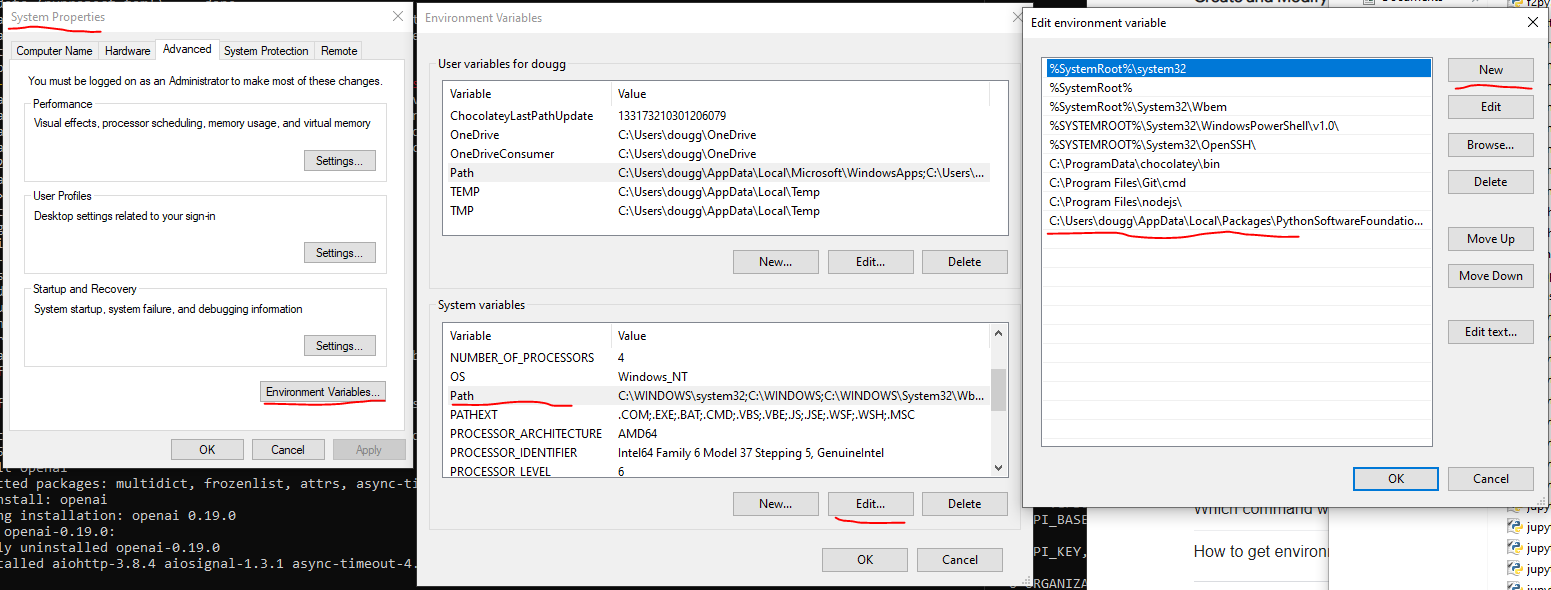 이렇게 환경 변수에 OPENAI_API_KEY 를 세팅 한 후 모두 OK 버튼을 눌러서 닫습니다.