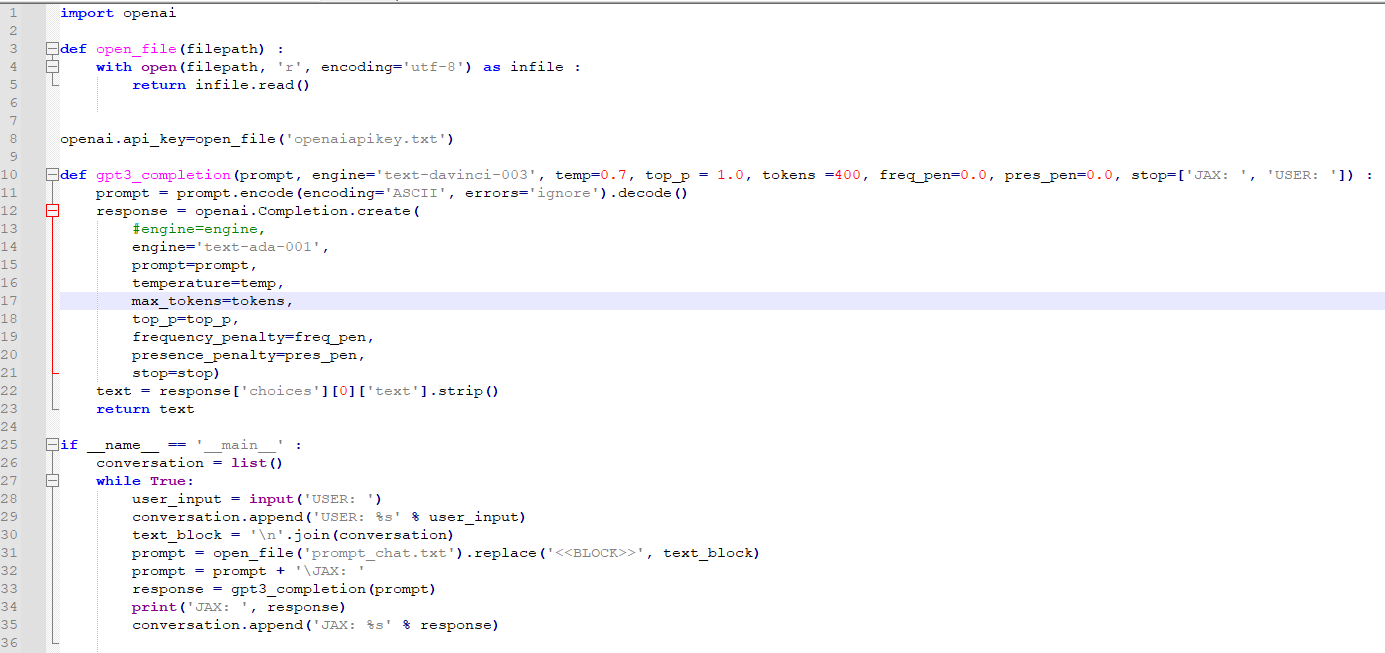gpt3_completion() 이란 함수를 선언했고 파라미터는 8개나 되네요.이 파라미터들은 함수 안에서 사용하게 될 겁니다.