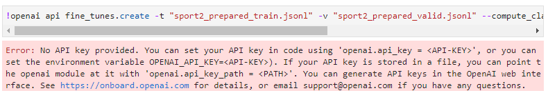 Error: No API key provided. You can set your API key in code using 'openai.api_key = <API-KEY>', or you can set the environment variable OPENAI_API_KEY=<API-KEY>). If your API key is stored in a file, you can point the openai module at it with 'openai.api_key_path = <PATH>'. You can generate API keys in the OpenAI web interface. See https://onboard.openai.com for details, or email support@openai.com if you have any questions.