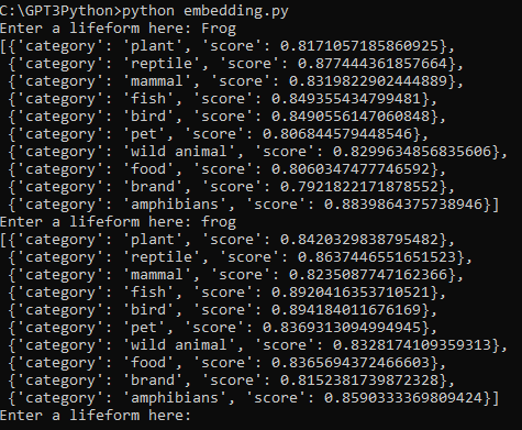 if __name__ == '__main__': categories = ['plant', 'reptile', 'mammal', 'fish', 'bird', 'pet', 'wild animal', 'food', 'brand', 'amphibians'] classes = list() for c in categories: vector = gpt3_embedding(c) info = {'category': c, 'vector': vector} classes.append(info) #print(classes) #exit(0) while True: a = input('Enter a lifeform here: ') vector = gpt3_embedding(a) #print(a, vector) result = match_class(vector, classes) pprint(result)