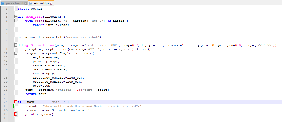 파라미터는 openaiapikey.txt 입니다. 따로 폴더 정보가 없으면 현재 폴더에서 해당 파일을 찾아서 열게 됩니다.이 텍스트 파일은 미리 만들어서 그 안에 API 키 정보를 넣어 두어야 합니다.