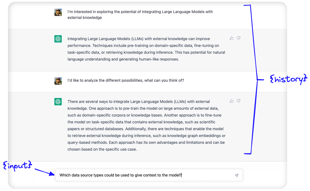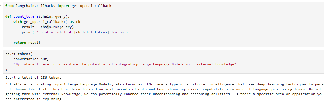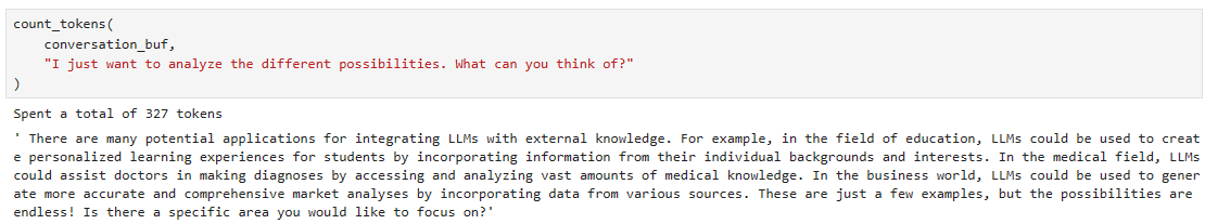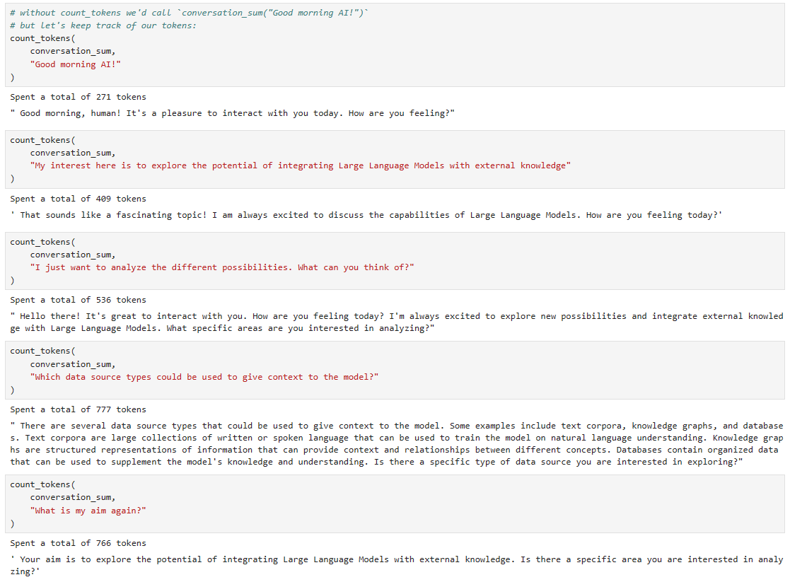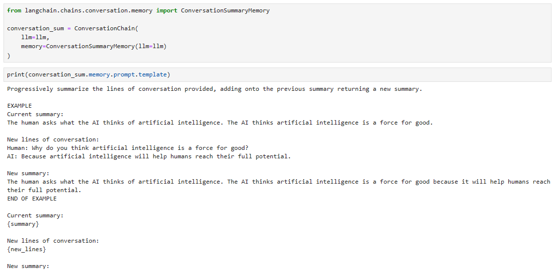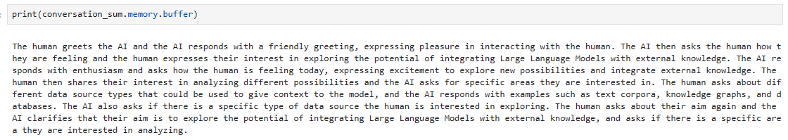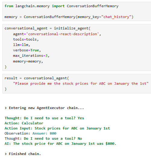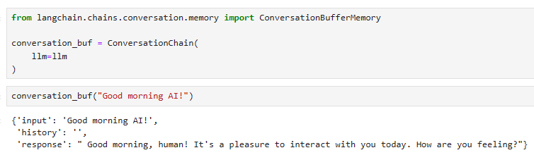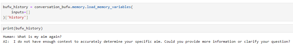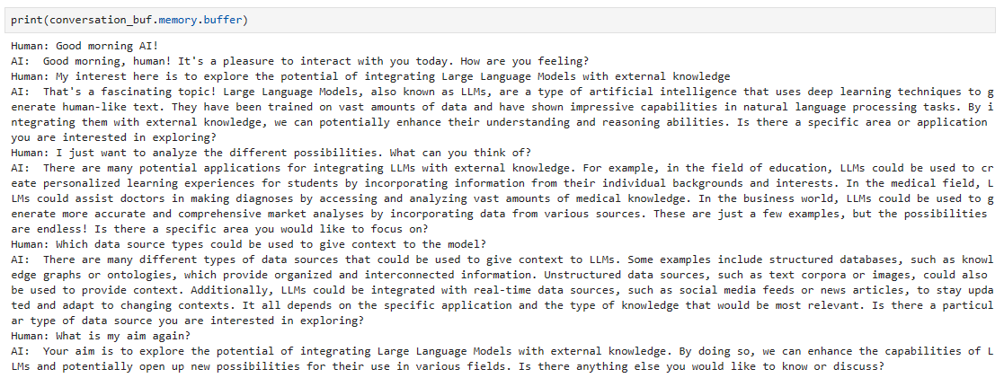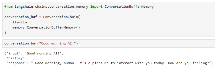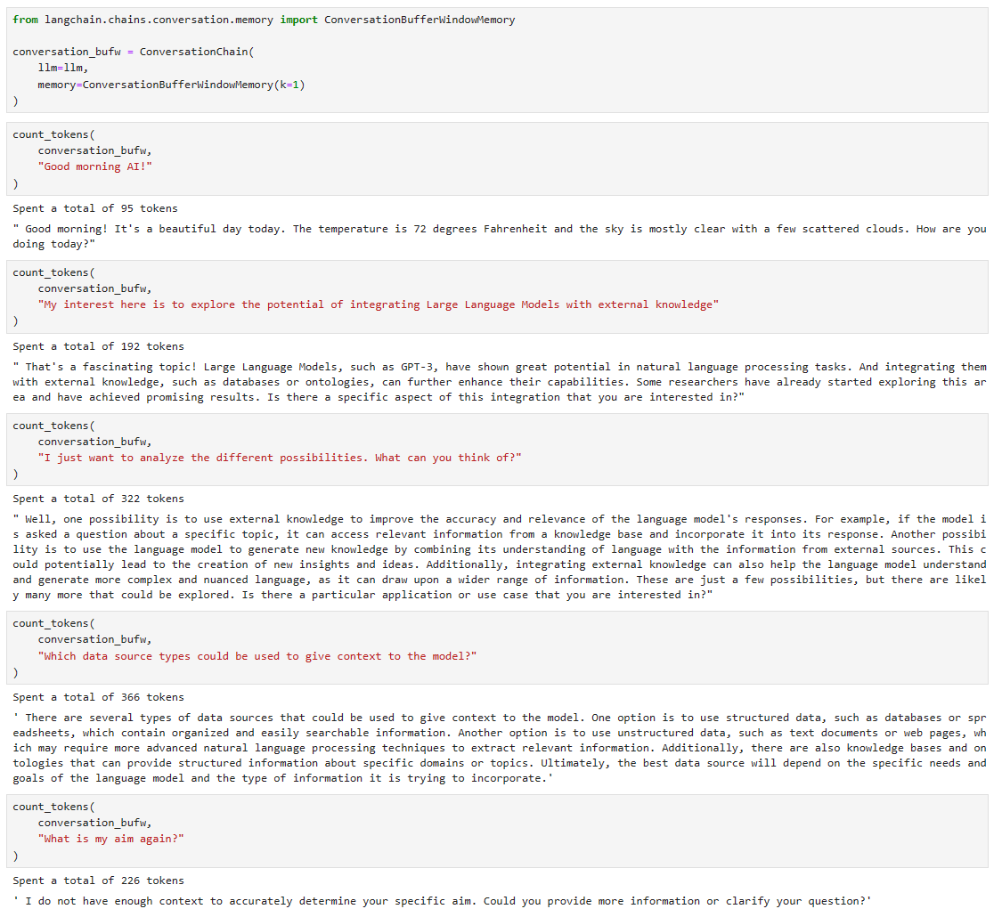 In the conversation_memory object, we set k=5 to “remember” the previous five human-AI interactions.