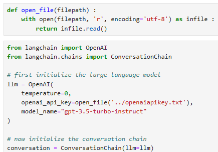 From here, we need to initialize the LLM and conversational memory for the conversational agent. For the LLM, we will use OpenAI’s gpt-3.5-turbo model. To use this, we need an OpenAI API key.