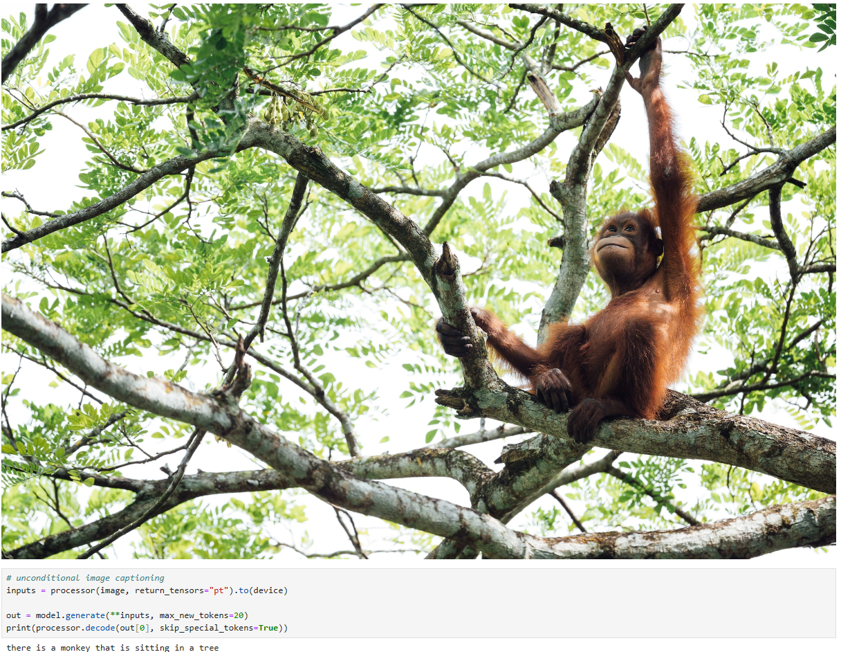 With this, we’ve downloaded an image of a young orangutan sitting in a tree. We can go ahead and see what the predicted caption for this image is: