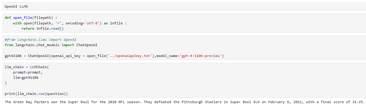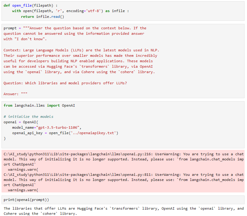 - from langchain.chat_models import ChatOpenAI: langchain 패키지에서 ChatOpenAI 모델을 가져옵니다. 이 모델은 OpenAI의 GPT-3.5-turbo를 기반으로 한 대화형 언어 모델입니다.