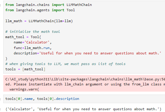 LangChain이 객체를 유효한 도구로 인식하는 데 필요한 두 가지 속성이 있습니다. 이는 이름 및 설명 매개변수입니다.