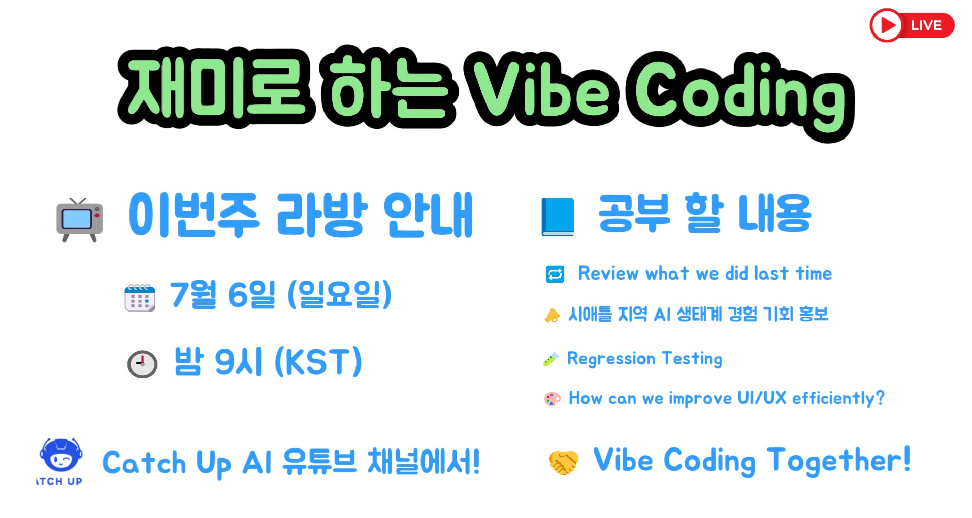 AI와 협력하며 즉흥적으로 코딩을 함께 경험 실패를 두려워하지 않고 새로운 기능을 실험 함께 배우며 성장하는 진짜 협업 프로젝트 만들기