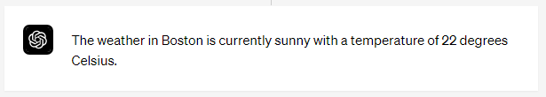 "content": "The weather in Boston is currently sunny with a temperature of 22 degrees Celsius.",