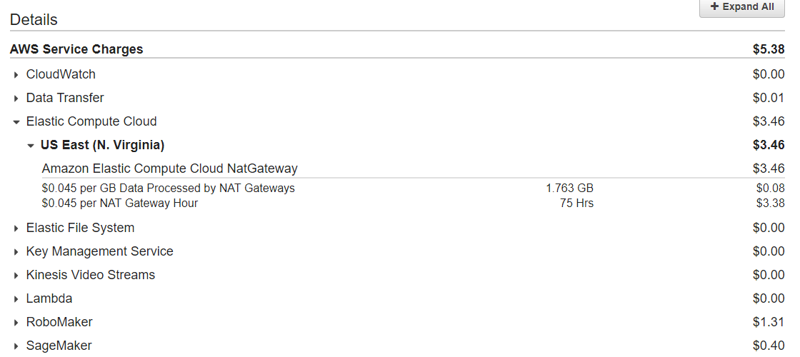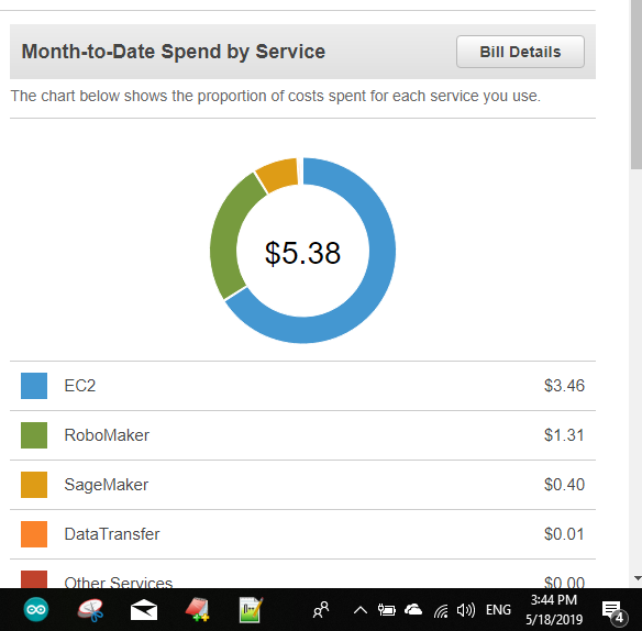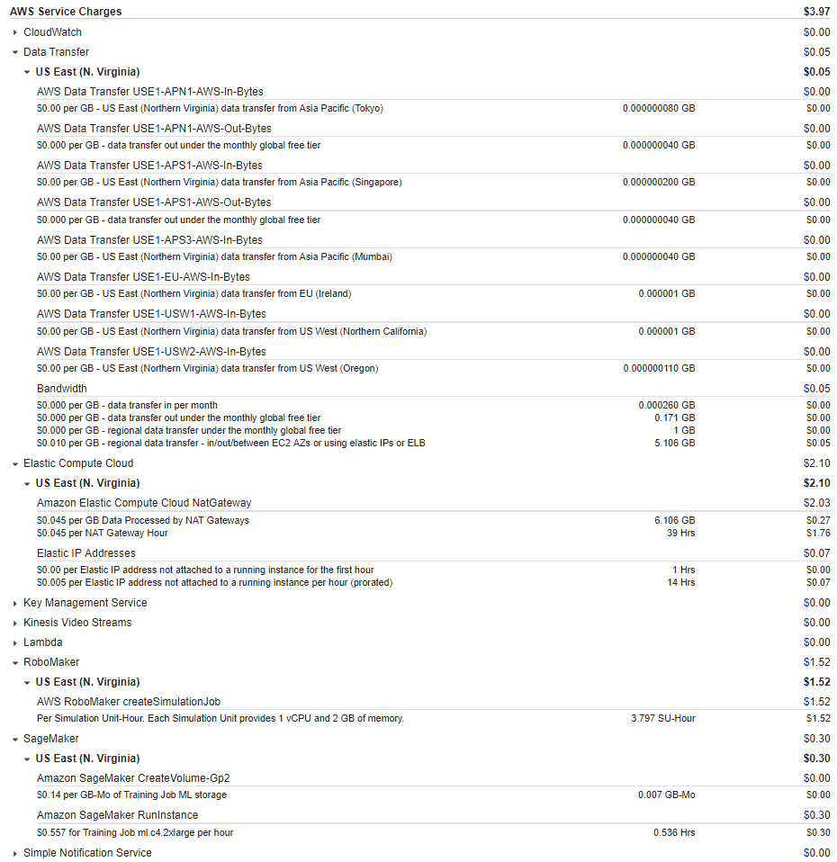 * 그 다음은 시뮬레이터 서비스인 RoboMaker 서비스에 대해 1.52달러가 청구됐고 SageMaker는 30센트가 청구됐다.