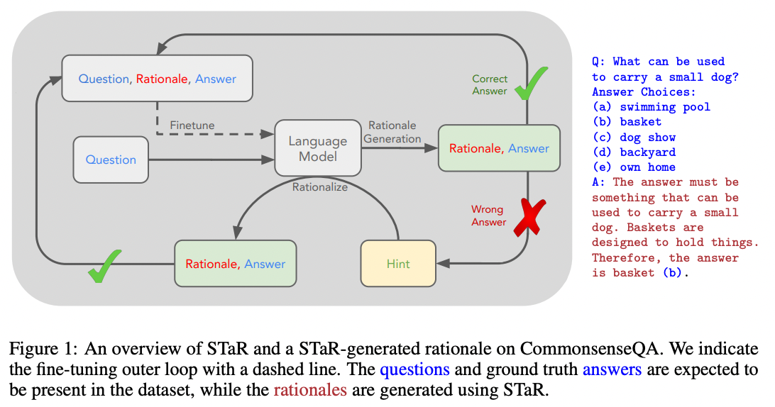 많은 예제 설명을 작성하는 것이 어렵게 들릴 수 있지만 큰 언어 모델을 사용하여 설명을 작성할 수 있습니다. 2022년 Zelikman, Wu, et al. {질문, 답변} 세트에서 {질문, 근거, 답변} 세트를 생성하기 위해 몇 번의 프롬프트를 사용할 수 있는 STaR(Self-Taught Reasoner)라는 절차를 발표했습니다.