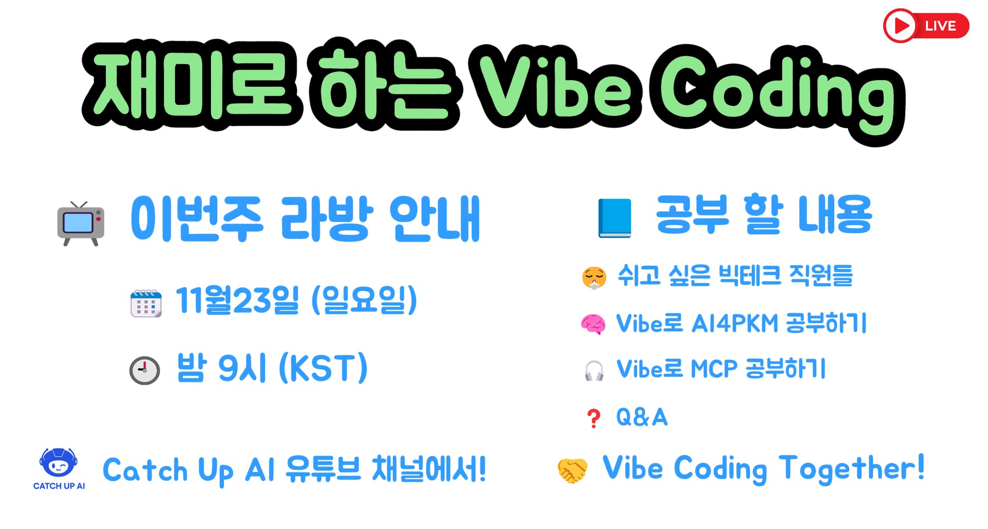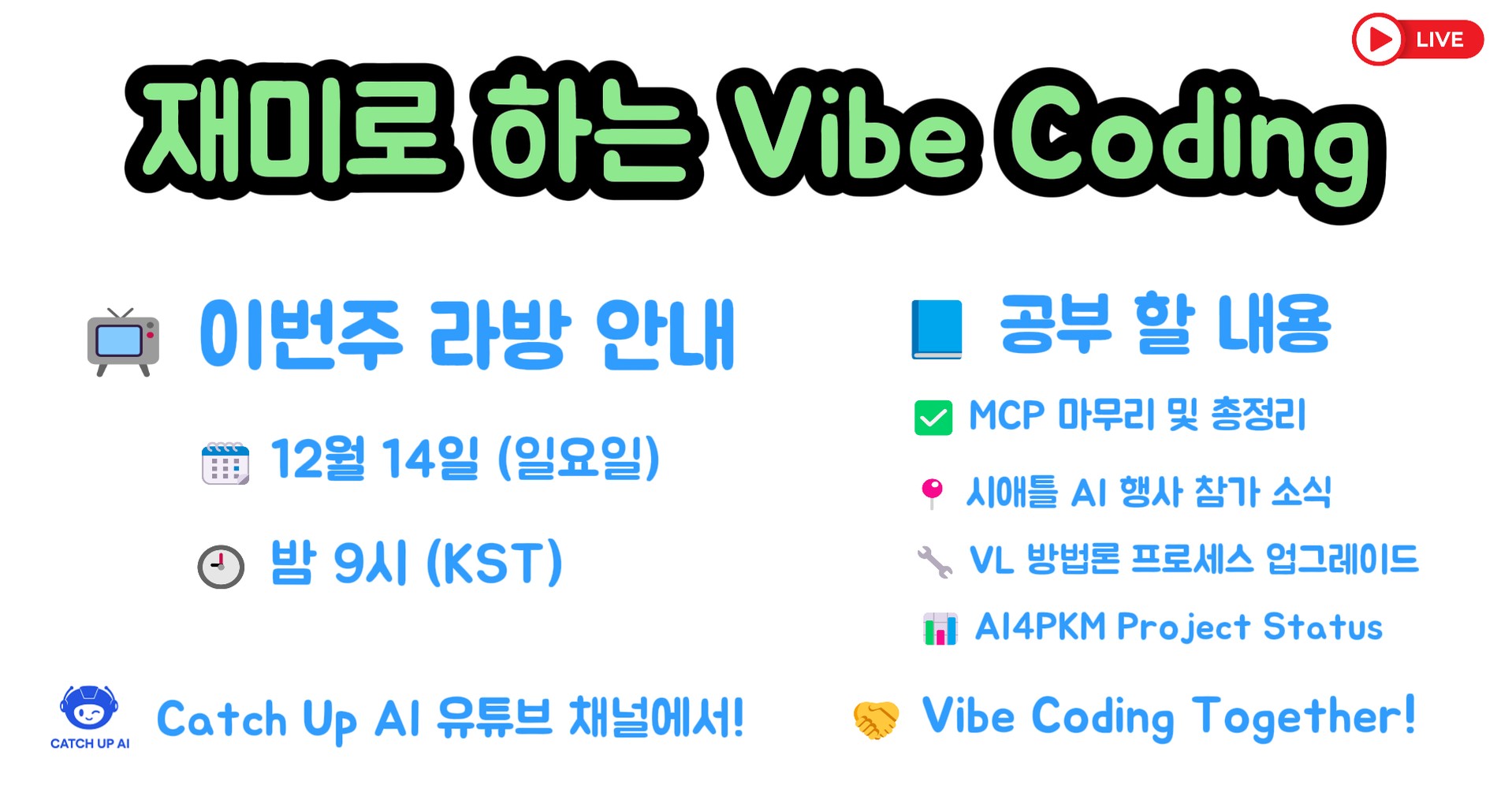 지난주에는 주중에 Vibe Learning 을 통해서 AI4PKM Automation Script를 공부하고 있는데요. 이 소식도 전해 드릴께요. 그리고 Vibe 로 MCP 공부하기는 계속 진행합니다. 이번주 라이브 방송에서는 이런 이야기들을 나눠 드리겠습니다.