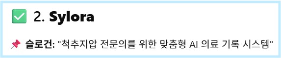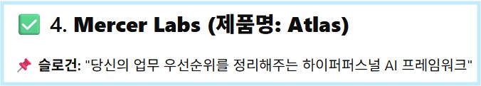 🧠 NodeTree io – 당신의 두 번째 두뇌가 되어줄 AI 기반 연구 조력자 💬 Sylora – 척추지압 전문의를 위한 맞춤형 AI 의료 기록 시스템 🧘♀️ MENTEM.lab – 우울증 치료의 사각지대를 없애는 AI 정신건강 플랫폼 🗂 Mercer Labs (Atlas) – 업무 우선순위를 정리해 주는 하이퍼퍼스널 AI 프레임워크