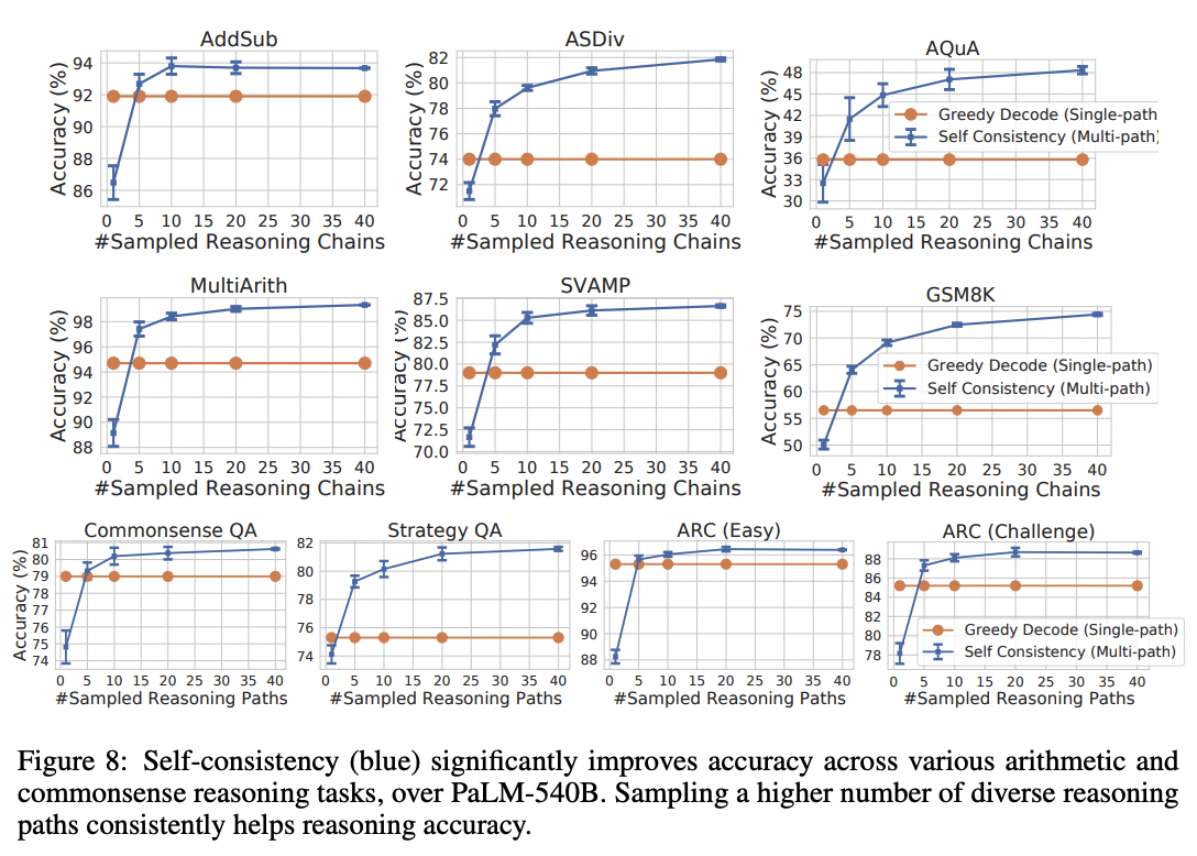 descrete set의 답변이 있는 task에 대해 신뢰도를 제고시킬 수 있는 간단한 방법 중 하나는 모델에서 여러 explanation 및 답변을 샘플링 한 다음에 (positive temperature를 사용) 가장 자주 등장하는 답변을 최종 답변으로 선택하는 겁니다.