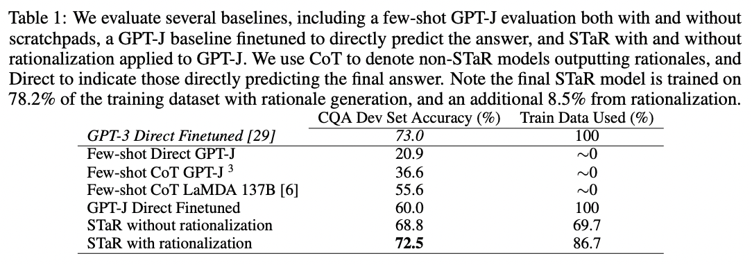 | If you want to fine-tune a step-by-step reasoner, you can do it with multiple-choice question & answer data alone | STaR: Bootstrapping Reasoning With Reasoning | 2022 Mar |