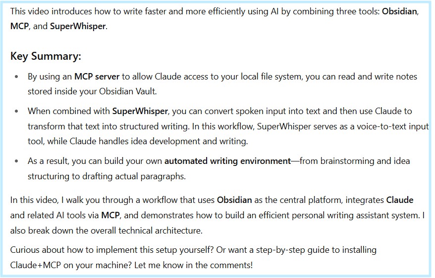 🎓 Study Group Presentation – Research on Integrating Obsidian with RAG – PKM Project | My AI 2nd Brain 🧠🤖📚 This video is a presentation created for the PKM (Personal Knowledge Management) Study Group based in the Seattle area. Our group studies how to build a personalized “Second Brain” using AI, aiming to enhance knowledge management and productivity. 📌 This presentation covers the following topics: 🔹 How to integrate Obsidian with RAG (Retrieval-Augmented Generation) 🔹 Differences between Standalone Applications and Plug-in-based implementations 🔹 Comparison of Local and Web-based approaches 🔹 Case study: Building an automated writing environment using MCP, Claude, and SuperWhisper 🔹 Analysis and selection of Obsidian AI plug-ins for hands-on practice 🔹 Future development strategies and direction