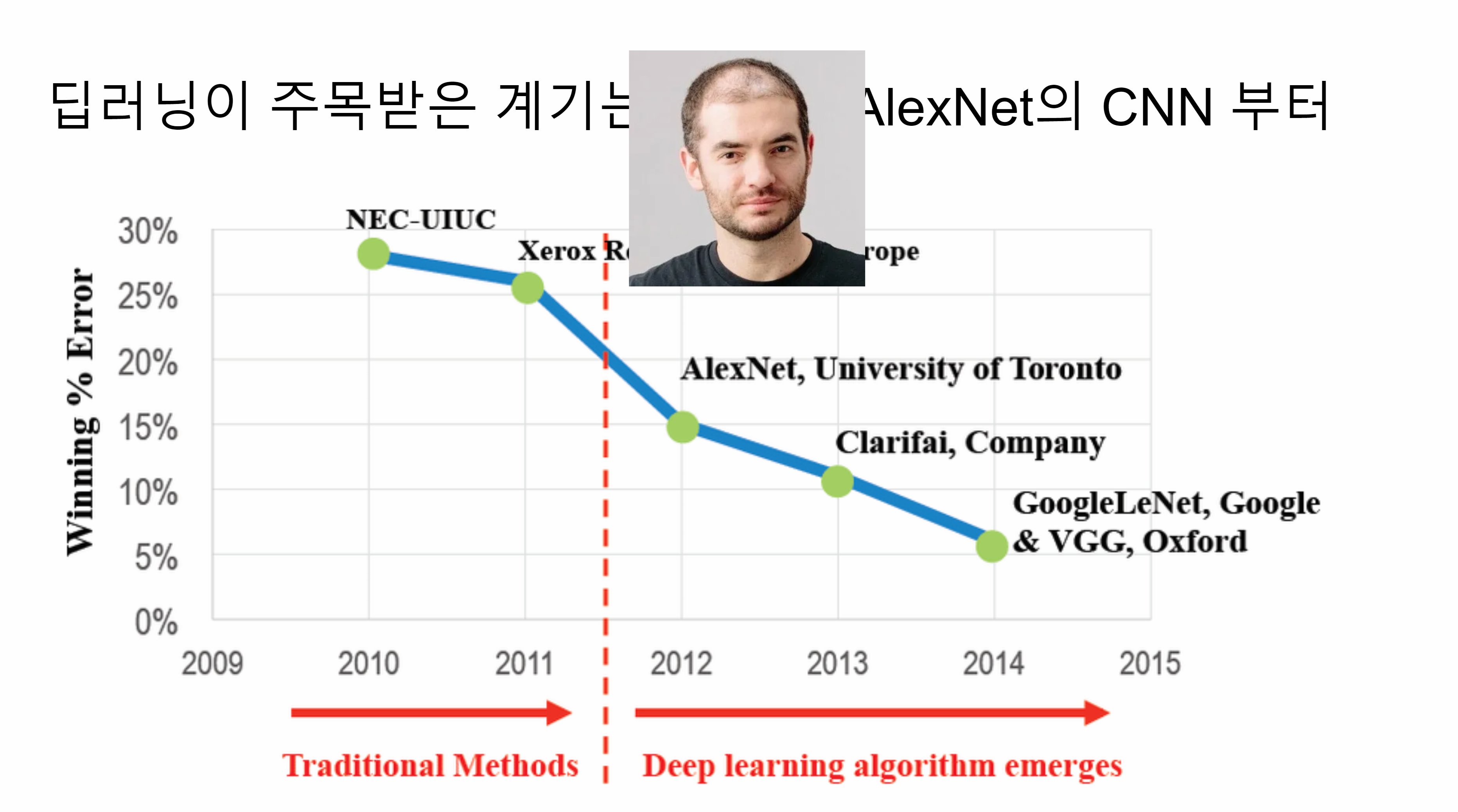 바로 Deep Learning을 다시 보게 했던 그 유명한 국제 이미지넷 경연대회에서 1등한 팀입니다.