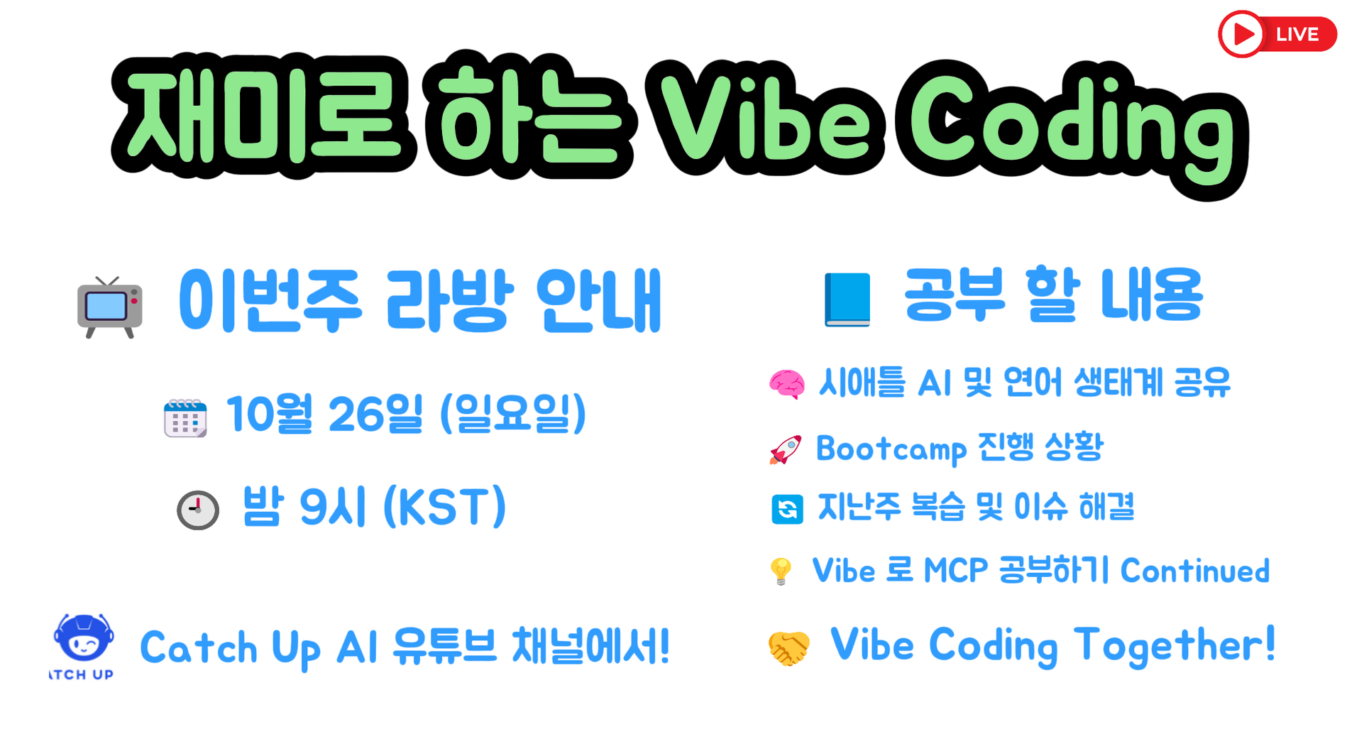 이번주 라이브 방송에서는 지난주에 이어서 그동안 진행해온 Vibe Learning 경험을 기반으로 세부적인 방법론을 만듭니다. 특정 주제에만 한정하지 않고 범용적으로 사용할 수 있도록 구조화 하는 방법을 Claude Code 와 함께 합니다. Vibe 로 AI4PKM 공부하기 코너도 완료 했습니다. Vibe 로 MCP 공부하기, Vibe 로 AI4PKM 공부하기 진행 완료 후 범용 방법론 만들기 입니다. 2025년 마무리는 이렇게 합니다. 2026년도 계획도 같이 얘기 나눠 보겠습니다.