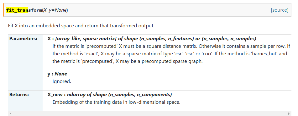 fit_transform()은 전달받은 파라미터를 embedded space로 fit 해 주고 transformed output으로 return 합니다.