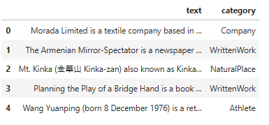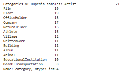 print("Categories of DBpedia samples:", samples["category"].value_counts())