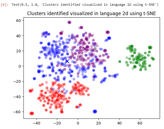 plt.title("Clusters identified visualized in language 2d using t-SNE")