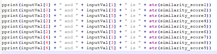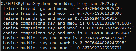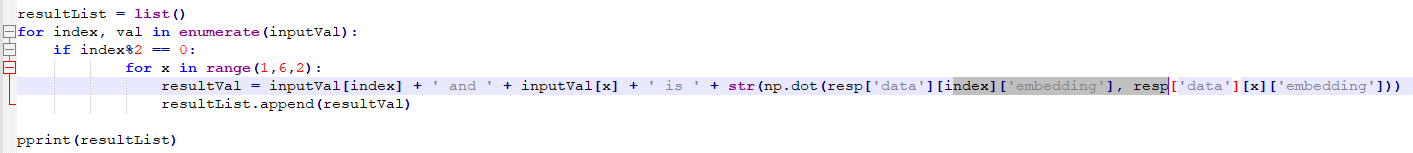 resultList = list() for index, val in enumerate(inputVal): if index%2 == 0: for x in range(1,6,2): resultVal = inputVal[index] + ' and ' + inputVal[x] + ' is ' + str(np.dot(resp['data'][index]['embedding'], resp['data'][x]['embedding'])) resultList.append(resultVal)