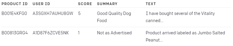 The dataset contains a total of 568,454 food reviews Amazon users left up to October 2012. We will use a subset of 1,000 most recent reviews for illustration purposes. The reviews are in English and tend to be positive or negative. Each review has a ProductId, UserId, Score, review title (Summary) and review body (Text). For example:
