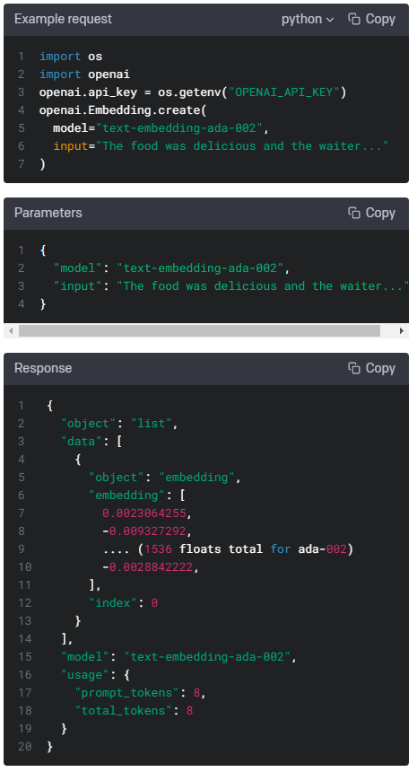 임베딩을 받으려면 임베딩 모델 ID(예: text-embedding-ada-002) 선택과 함께 텍스트 문자열을 임베딩 API 엔드포인트로 보냅니다. 응답에는 추출, 저장 및 사용할 수 있는 임베딩이 포함됩니다.